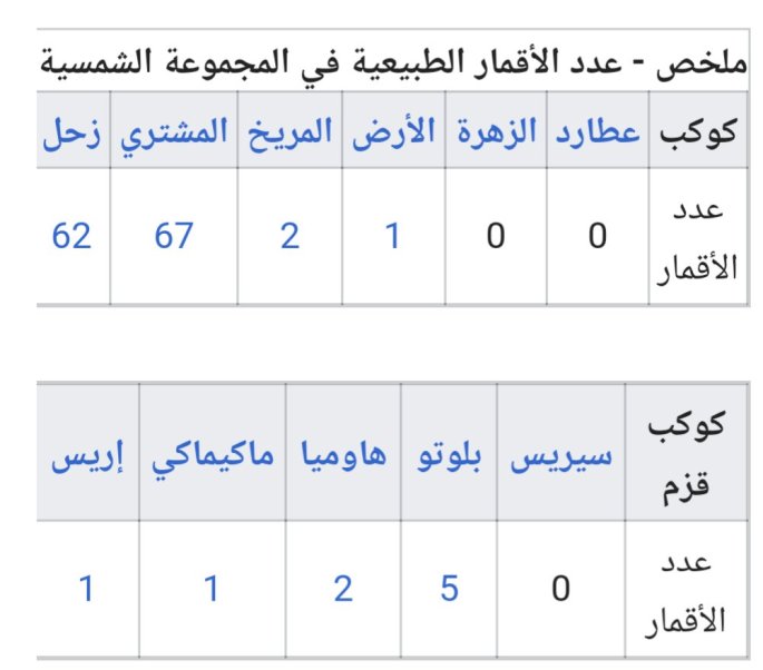الاكتشافات الأولى للأقمار الطبيعية تمت من قبل غاليليو غاليلي وهي تسمى أقمار غاليليو الأربعة التابعة لكوكب المشتري، اكتشفها في يناير عام 1610 للميلاد. وعلى مر القرون الثلاثة التالية لم يتم اكتشاف سوى عدد قليل من الأقمار. البعثات إلى الكواكب الأخرى في عام 1970، وأبرزها فوياجر 1 و 2 شهدت زيادة في عدد الأقمار المكتشفة، وعمليات الرصد منذ عام 2000، وذلك باستخدام التلسكوبات الأرضية البصرية الكبيرة في الغالب، اكتشفت الكثير من الأقمار وكلها أقمار غير منتظمة.القمر الطبيعي هو جسم فلكي يدور حول كوكب أو جسم أصغر من كوكب (كوكب صغير) أو في بعض الأحيان حول جرم نظام شمسي صغير. هناك 182 قمرًا طبيعي في المجموعة الشمسية منها 173 تدور حول الكواكب الثمانية و7 تدور حول كواكب قزمة وعشرات أخرى تدور حول أجسام أصغر في المجموعة الشمسية.ومن المعروف أن أربعة كواكب قزمة مدرجة من قبل الاتحاد الفلكي الدولي لها قمر طبيعي وهى: بلوتو، هوميا، ماكيماكي، وإيريس واعتبارا من أول يناير 2012، تم اكتشاف أكثر من 200 قمر حول الكواكب الصغيرة. من المحتمل جدًا وجود أقمار في نظم النجوم الأخرى لكن لم تشاهد بعد. وهناك 19 قمراً في المجموعة الشمسية كبير بما يكفي ليكون دائري الشكل بفعل الجاذبية. وبذلك ستعتبر كواكب أو كواكب قزمة لو كانت في مدار من باشر حول الشمس.\nتصنف الأقمار في فئتين منفصلتين وفقا لمداراتها: الأقمار المنتظمة التي لها مدرات انطلاقا من الغرب إلى الشرق (التي تدور في اتجاه دوران كواكبها ) وتقع على مقربة من مستوى خط الاستواء.والأقمار غير النظامية ذات حركة تراجعية (التي تدور عكس اتجاه دوران كواكبها) وغالبا ما تقع في زوايا متطرفة بالنسبة إلى خط الاستواء لكواكبها. القمر الغير النظامي ربما كان من الكواكب الصغيرة التي تم الاستيلاء عليها من الفضاء المحيط بالكواكب ومعظم الأقمار غير النظامية أقطارها أقل من 10 كيلومتر ما يعادل (6.2 ميل).\nالاكتشافات الأولى للأقمار الطبيعية تمت من قبل غاليليو غاليلي وهي تسمى أقمار غاليليو الأربعة التابعة لكوكب المشتري، اكتشفها في يناير عام 1610 للميلاد. وعلى مر القرون الثلاثة التالية لم يتم اكتشاف سوى عدد قليل من الأقمار. البعثات إلى الكواكب الأخرى في عام 1970، وأبرزها فوياجر 1 و 2 شهدت زيادة في عدد الأقمار المكتشفة، وعمليات الرصد منذ عام 2000، وذلك باستخدام التلسكوبات الأرضية البصرية الكبيرة في الغالب، اكتشفت الكثير من الأقمار وكلها أقمار غير منتظمة.\nالأقمار الطبيعية في المجموعة الشمسية\nعدل\nعدد ألأقمار المكتشفة في كل عام\n\nعطارد هو أصغر كواكب المجموعة الشمسية وأقربها إلى الشمس ولا يوجد له أقمار طبيعية. على الرغم من ظهور فرضية لفترة وجيزة في اوائل 1970 بوجود تابع لكوكب عطارد ولكن اتضح أن البيانات التي فُسرت على أنها قمر لعطارد تعود لنجم.\nالزهرة الكوكب الثاني في المجموعة الشمسية من حيث البعد عن الشمس ولا يوجد له أقمار طبيعية.\nعلى الرغم من عمليات الرصد في عام 1650 لجرم اعتقد انة قمر للزهرة واطلق علية نيث وتم رصده 30 مرة من قبل علماء الفلك حتى عام 1770، وعندما لم تكن هناك مشاهدة جديدة ولم يتم العثور عليه أثناء عبور الزهرة في 1761 و 1769 تم دحض هذه الفرضية.\nالأرض ثالث كواكب المجموعة الشمسية بعدًا عن الشمس بعد عطارد والزهرة، وتعتبر أكبر الكواكب الأرضية في النظام الشمسي، يمثلالقمر القمر الطبيعي الوَحيد للكرة الأرضية.\n\nفوبوس وديموس قمرا المريخ\nقمرا المريخ للمريخ قمرين معروفة هما، فوبوس وديموس، والتي يعتقد أنها كانت كويكبات تم اجتذابها إلى مدار المريخ. تم اكتشاف كلا القمرين على حد سواء في عام 1877 من قبل عالم الفلك آساف هول. وكانت عمليات البحث عن المزيد من الأقمار غير ناجحة، ووضع الحد الأقصى لدائرة نصف القطر لقمر قد يكون تابع للمريخ في 90 مترا (100 ياردة).\nالمشتري وأقمار غاليليو\nللمشتري 67 قمراً مؤكدة الوجود، وبالتالي فله أكبر عدد من الأقمار ذات المدارات المستقرة بشكل معقول في المجموعة الشمسية. الأبرز بين هذه ال