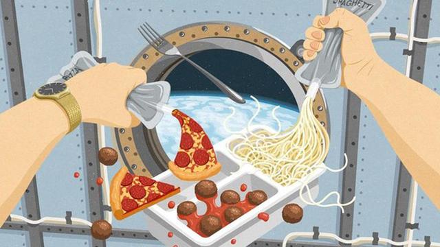 كما في الحياة على الأرض فإنّ رواد الفضاء يحتاجون لتناول الطعام والتخلص من فضلاته وبقاياه بالإضافة إلى تخزينه، ويمكن إحضار العديد من الأصناف المختلفة من الطعام إلى الفضاء، ويحتاج بعضها إلى إضافة الماء حتى يتمكن رائد الفضاء من أكله مثل المعكرونة، والبعض الآخر لا يحتاج إلى إضافة شيء ويؤكل كما هو مثل الفواكه. وفي الواقع يتوافر فرن للطهي في محطة الفضاء لتسخين الطعام وتحضيره، ولكن لا توجد ثلاجة في المحطة لذلك من المهم حفظ الأطعمة بشكلٍ جيد خاصةً للمهام طويلة الأمد. ويمكن لرائد الفضاء إضافة الكاتشب، أو الخردل، أو المايونيز إلى طعامه في الرحلة الفضائية، ويوجد أيضاً الملح والفلفل الأسود لكنّهما يتوافران على شكل سائل فقط؛ وهذا لأنّ رواد الفضاء لا يمكنهم رش الملح والفلفل الأسود خلال الرحلة الفضائية وذلك لأنّه سوف يعوم، وهذا الأمر خطيرٌ جداً؛ إذ إنّه من الممكن أن يتسبّب في غلق فتحات التهوية، أو أن يلوّث المعدات الخاصة برواد الفضاء، أو أن يدخل في عيون أو أنوف رواد الفضاء ويؤذيهم.